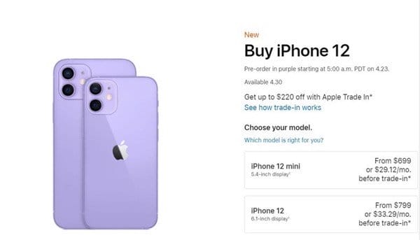 Cụ thể trên website của Apple giá của iPhone 12 màu tím mới là 799$ và iPhone 12 mini là 699$. Tuy là màu sắc mới nhưng mức giá sẽ giống như các màu khác của thiết bị trước đó, có nghĩa là bạn sẽ không phải trả một cái giá quá đắt cho mẩu mới này.