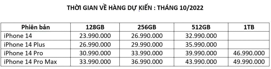 – iPhone 14 Pro phiên bản 1TB: 42.990.000 đồng