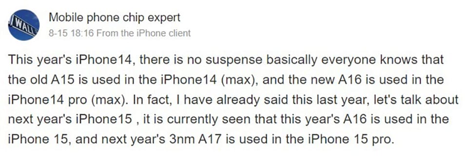 Rò rỉ hôm nay còn cho biết các mẫu iPhone 15 tiêu chuẩn sẽ sử dụng chip A16 Bionic, cùng một SoC dự kiến sẽ cung cấp sức mạnh cho dòng iPhone Pro năm nay. Hiện chúng ta không hoàn toàn chắc chắn liệu Apple có ý định chính thức gọi chip 3nm mới của mình là A17 Bionic hay không.