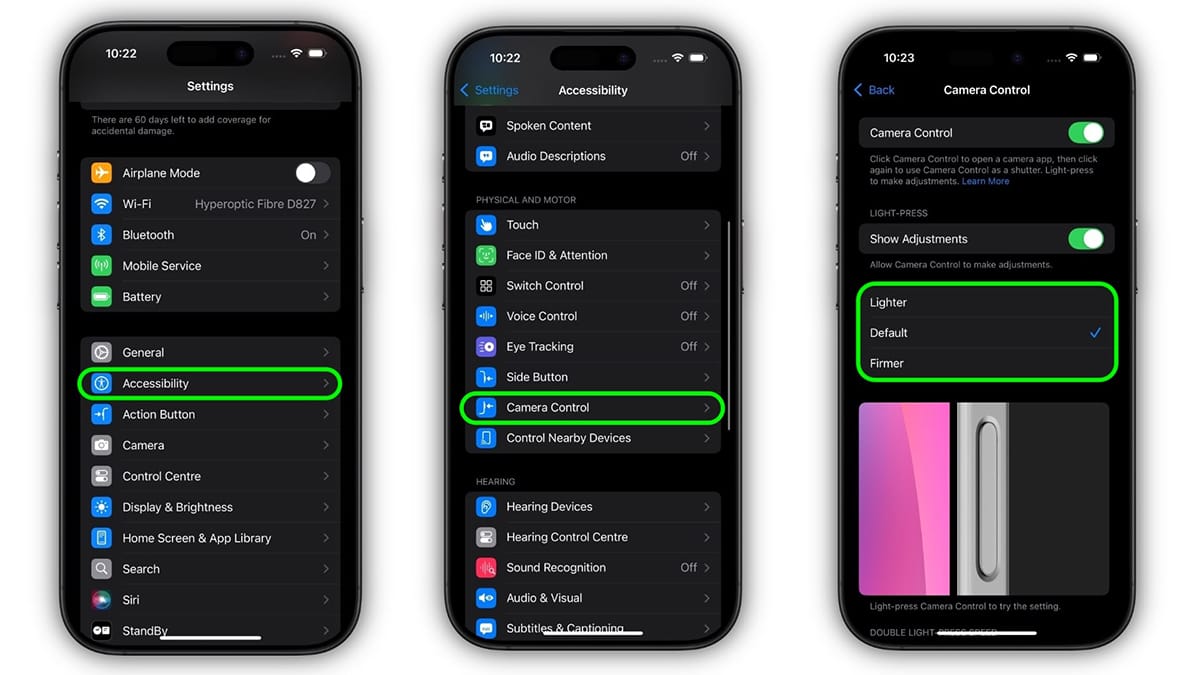 Nếu bạn ở lại màn hình menu này, bạn có thể thử các mức lực nhấn khác nhau của nút Điều khiển Camera mà không cần mở ứng dụng Camera, vì vậy hãy đảm bảo bạn thử cả ba tùy chọn trước khi quyết định chọn một tùy chọn.