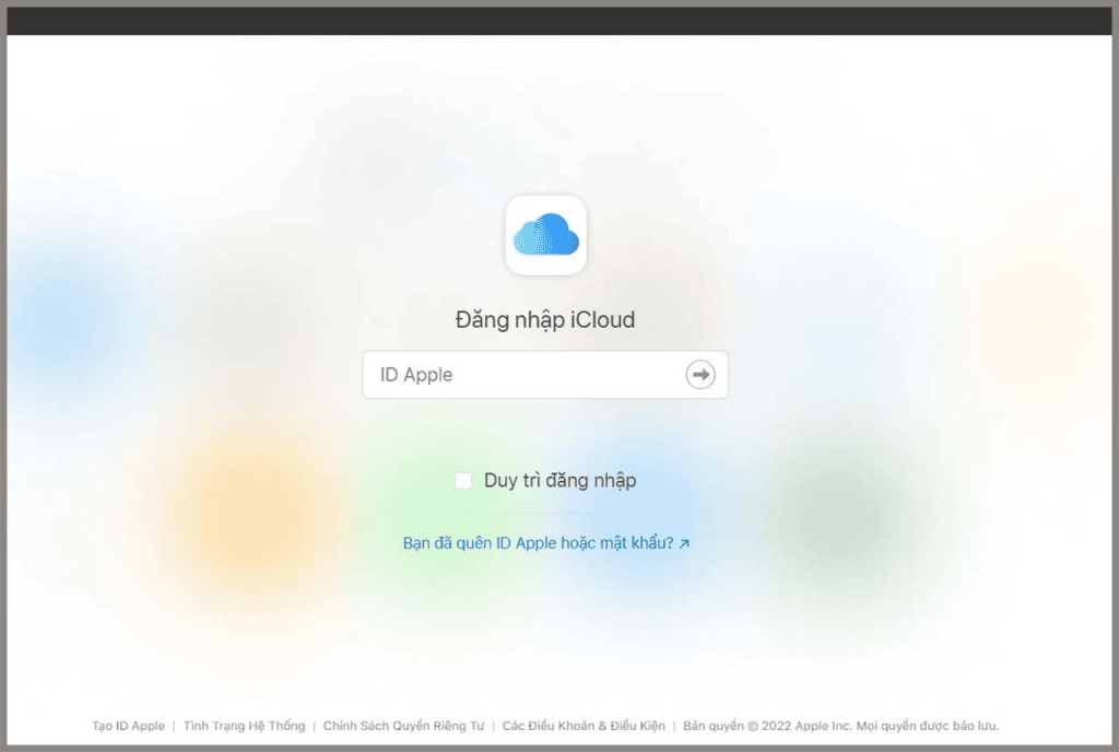 Bước 1: Truy cập vào iCloud trên máy tính hoặc thiết bị khác như apple iPhone, iPad,… (trừ smartphone Android) tại đây, sau đó tiến hành đăng nhập tài khoản iCloud của bạn.