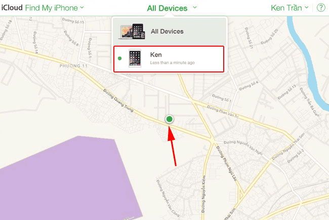 Bước 3: Sau khi đã hoàn thiện đăng nhập thì hệ thống sẽ tự động dò tìm các thiết bị của bạn, nếu có kết nối mạng thì sẽ cho bạn biết chính xác vị trí iPhone/iPad bị mất. Trong phần All Device (Tất cả thiết bị), bạn chọn vào iPhone/iPad muốn tìm.