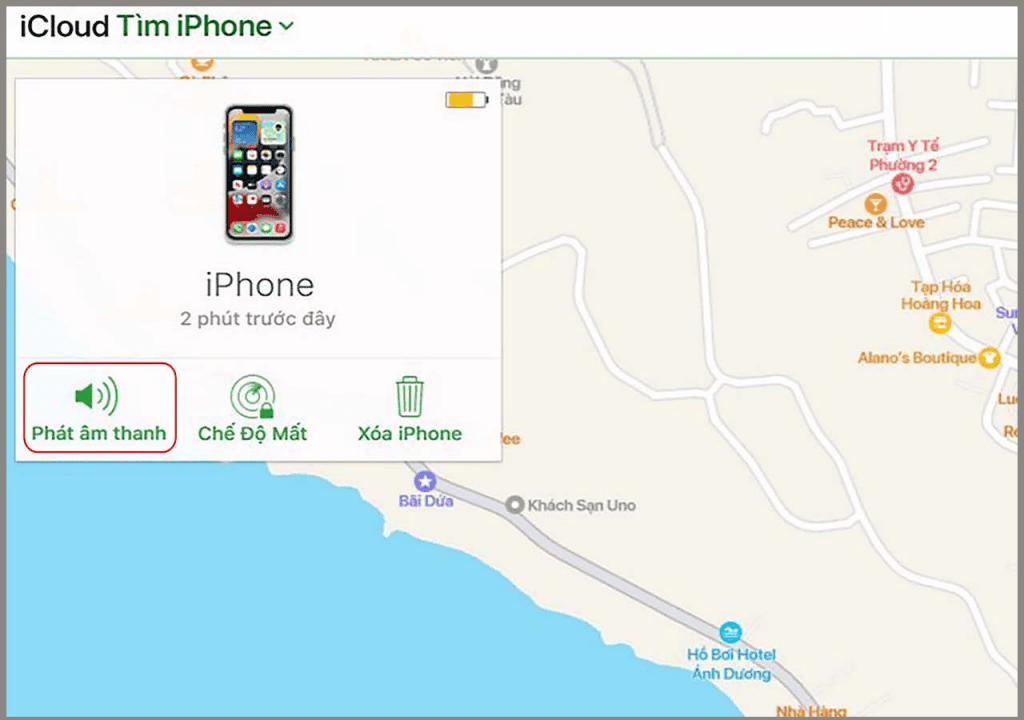 – Phát âm thanh (Play Sound): iPhone của bạn sẽ đổ chuông và bạn có thể sẽ phát hiện được iPhone của mình nếu ở gần.