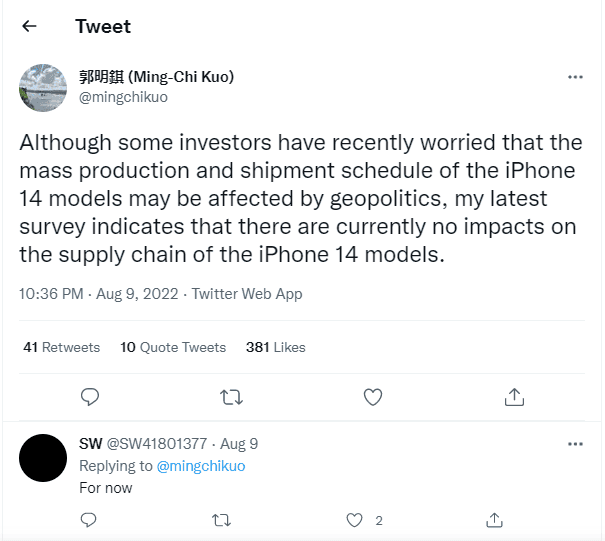 Theo nhà phân tích đáng tin cậy Ming-Chi Kuo, dòng sản phẩm iPhone 14 không phải đối mặt với các tác động đến chuỗi cung ứng vì lịch trình sản xuất hàng loạt và giao hàng đang đi đúng hướng. Mặc dù tình hình chính trị có thể khiến các nhà đầu tư lo lắng nhưng Kuo cho rằng mọi thứ vẫn ổn.