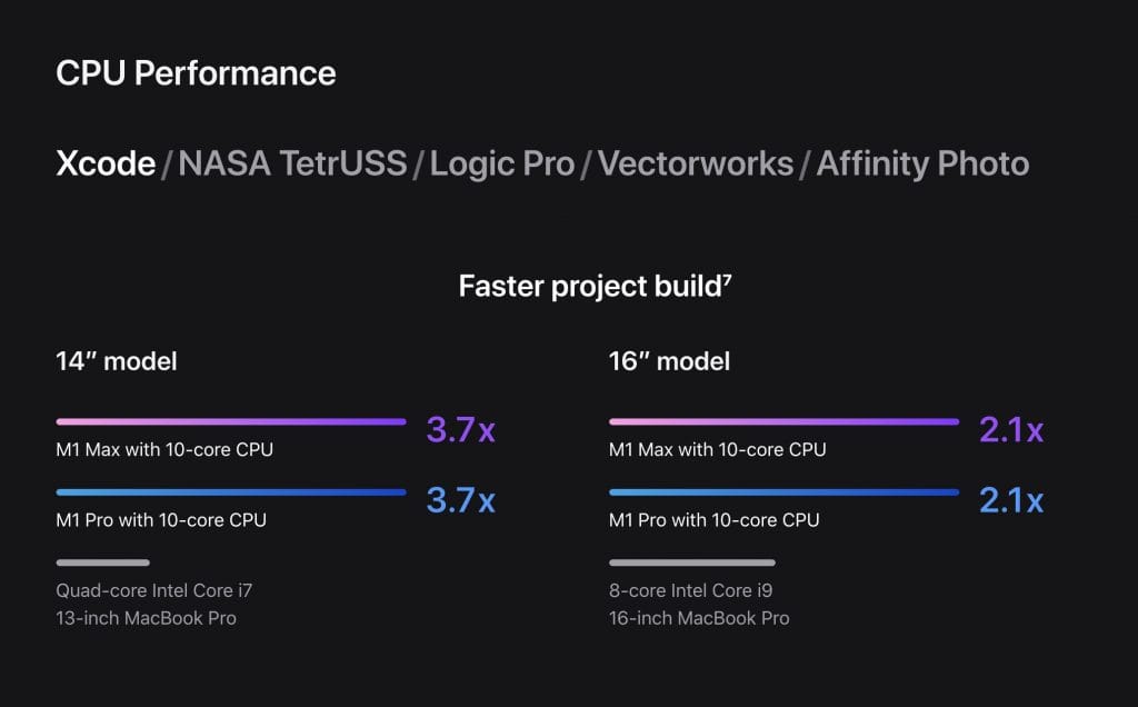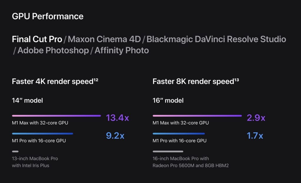Về hiệu năng, M1 Pro và M1 Max hứa hẹn cho hiệu năng CPU nhanh hơn tới 2 lần so với Intel Core i9 trên MacBook Pro 16 inch trước đó. Hiệu năng GPU cũng cực kỳ ấn tượng khi tốc độ render video 4K trên M1 Pro 16 GPU nhanh gấp 9.2 lần, M1 Max gấp 13.4 lần so với MacBook Pro 13 inch Intel trước đó. Thậm chí so với MacBook Pro 16 inch Core i9 và Radeon Pro 5600M tốc độ render video vẫn tăng tới 1.7 – 2.9 lần.