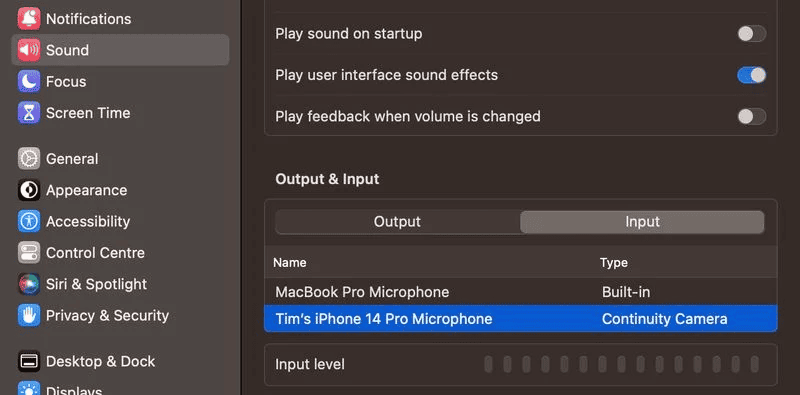Để bật tính năng này, hãy đi tới Cài đặt hệ thống -> Âm thanh , sau đó nhấp vào tab Đầu vào trong “Đầu ra & đầu vào”, bạn sẽ có thể xem và chọn tên của iPhone của mình, được liệt kê là loại “Máy ảnh liên tục”.