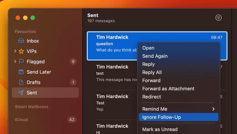 Nếu bạn không cần phản hồi cho email được đề cập, hãy trượt sang trái trên bàn di chuột để loại bỏ nó hoặc nhấp chuột phải vào thư và chọn Bỏ qua theo dõi trong menu ngữ cảnh.