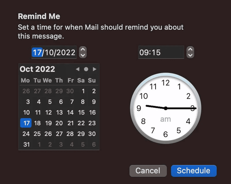 Chỉ cần nhấp chuột phải vào thư trong hộp thư đến của bạn, sau đó chọn Nhắc tôi từ menu thả xuống. Bạn sẽ thấy các tùy chọn bao gồm Nhắc tôi sau 1 giờ, Nhắc tôi tối nay, Nhắc tôi ngày mai và Nhắc tôi sau…. Tùy chọn cuối cùng sẽ hiện ra đồng hồ và lịch để bạn thiết lập ngày giờ cụ thể. Khi bạn đã hoàn thành việc đó, hãy nhấp vào Lịch biểu.