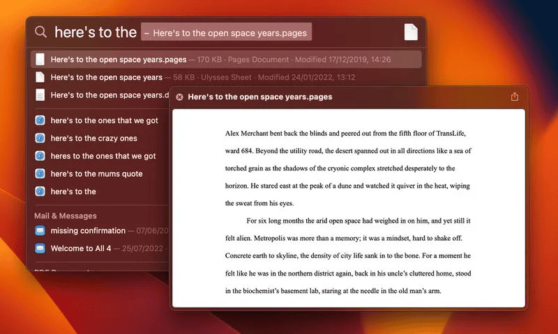 Chỉ cần nhấn thanh Dấu cách trên một kết quả để mở cửa sổ xem trước. Các tài liệu dựa trên văn bản cũng bao gồm hỗ trợ lựa chọn Sao chép đầy đủ.