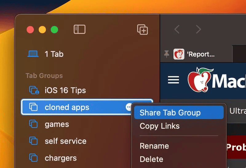 Để chia sẻ nhóm tab, hãy mở thanh bên của Safari, sau đó nhấp vào dấu chấm lửng (ba dấu chấm bao quanh) bên cạnh nhóm tab trong danh sách và chọn Chia sẻ nhóm tab. Menu Chia sẻ trang tính sẽ được hiển thị để bạn chọn phương pháp chia sẻ mong muốn.