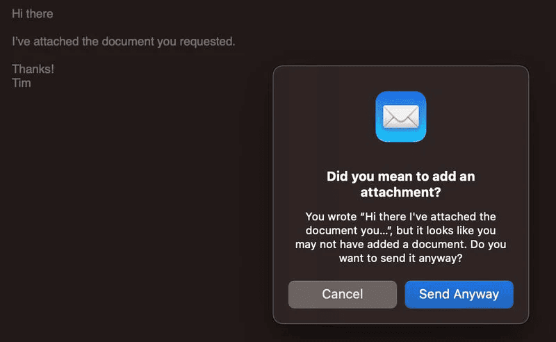 Rất may điều đó khó có thể xảy ra nữa, vì Mail giờ đây đủ thông minh để thông báo cho bạn nếu bạn quên đính kèm tệp đính kèm trước khi thư được gửi đi. Thư cũng sẽ thông báo cho bạn nếu nó cho rằng bạn đã bỏ sót người nhận.