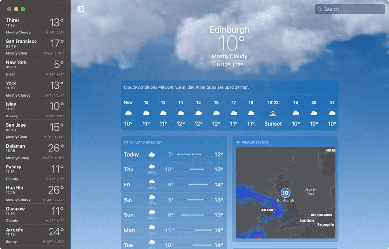 Nếu bạn đang dùng iPhone‌ hoặc ‌iPad‌ thì ứng dụng này trên Mac sẽ trông quen thuộc. Nó có tất cả các tính năng của ứng dụng iOS, bao gồm hình nền thời tiết động thay đổi dựa trên thời tiết tại vị trí của bạn, thông báo thời tiết khắc nghiệt, theo dõi chất lượng không khí, bản đồ thời tiết và dự báo.