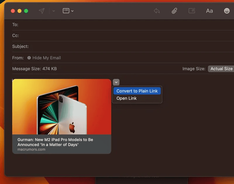 Trước đây trong Mail, nếu bạn dán một URL vào một tin nhắn, nó sẽ chỉ hiển thị địa chỉ web. Tuy nhiên, trong Ventura, các liên kết được hiển thị bản xem trước của trang web được liên kết đến, cung cấp cho người nhận ý tưởng về nội dung mà họ có thể mong đợi xem nếu họ truy cập trang web.