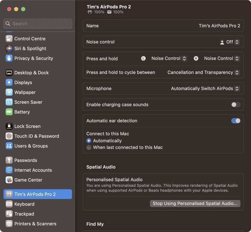 Trong Ventura, việc kết nối AirPods giúp bạn có một menu tùy chọn đầy đủ trong Cài đặt hệ thống, nơi bạn có thể kiểm soát mọi thứ từ Phát hiện tai cho đến âm thanh trong hộp sạc.