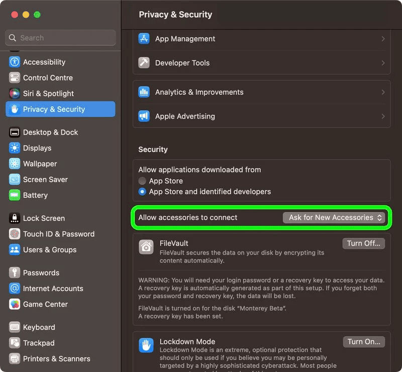 Bạn có thể thay đổi cấu hình bảo mật trong Cài đặt Hệ thống -> Bảo mật và Quyền riêng tư -> Bảo mật. Cấu hình mặc định là “Yêu cầu phụ kiện mới”. Định cấu hình Điều khiển công tắc trợ năng đặt chính sách luôn cho phép sử dụng phụ kiện. Các thiết bị được phê duyệt có thể kết nối với máy Mac bị khóa trong tối đa ba ngày.