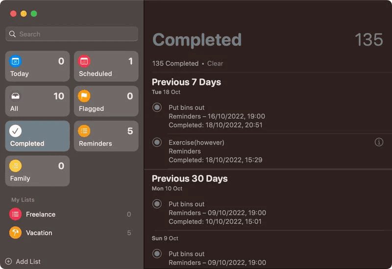 Trong ứng dụng Lời nhắc, có một ngăn Danh sách thông minh đã hoàn thành mới, nơi bạn có thể xem tất cả lời nhắc đã hoàn thành của mình trong bảy ngày trước, tháng trước và trong những năm qua.