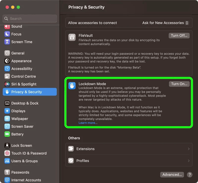 Một tính năng bảo mật macOS mới trong Cài đặt hệ thống -> Quyền riêng tư & Bảo mật là Chế độ khóa  nhằm bảo vệ một số ít người dùng có cấu hình cao có nguy cơ bị tấn công mạng có chủ đích từ phần mềm gián điệp do nhà nước bảo trợ, chẳng hạn như nhà báo, nhà hoạt động và nhân viên chính phủ.