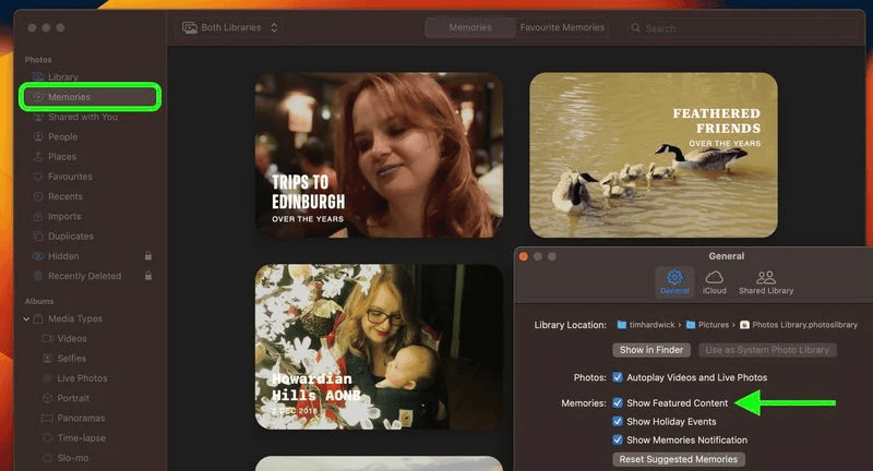 Nhấp vào Ảnh -> Cài đặt trong thanh menu, chọn tab Chung, sau đó trong phần “Kỷ niệm“, bỏ chọn hộp bên cạnh Hiển thị nội dung nổi bật. Tùy chọn Memories trong thanh bên sẽ biến mất.