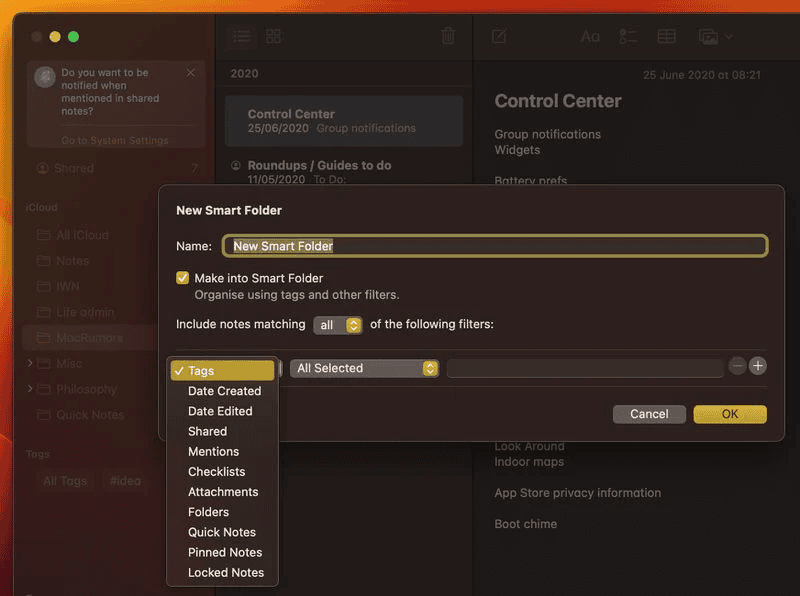 Ghi chú trong Thư mục thông minh có thể được tự động sắp xếp dựa trên các bộ lọc mới trong ‌macOS Ventura‌. Các quy tắc có sẵn cho Ngày tạo, Ngày sửa đổi, Chia sẻ, Đề cập, Danh sách kiểm tra, Tệp đính kèm, Ghi chú nhanh, Thư mục và hơn thế nữa.
