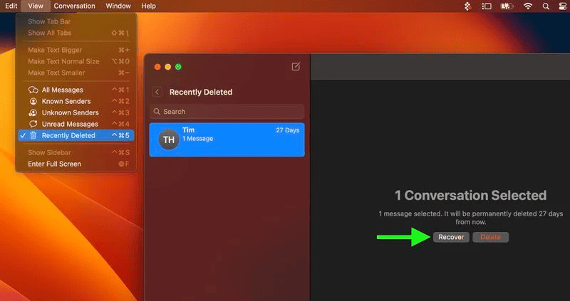 Chọn Xem -> Đã xóa gần đây từ thanh menu Tin nhắn, chọn cuộc trò chuyện tin nhắn bạn muốn khôi phục trong thanh bên, sau đó nhấp vào Khôi phục.