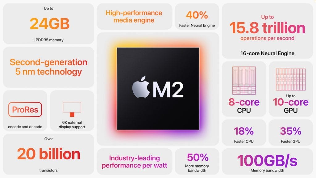 Tại sự kiện ra mắt, Apple nói rằng con chip M2 sẽ cải thiện 18% CPU và 35% GPU nhờ việc tăng số bóng bán dẫn (vẫn chỉ có 8 nhân) và tăng số lượng GPU lên tối đa thành 10 nhân. Tuy nhiên, phiên bản MacBook Air M2 cấu hình cơ bản cũng chỉ có 8 nhân GPU mà thôi, vì vậy hiệu suất đồ họa cũng sẽ không tăng quá nhiều.