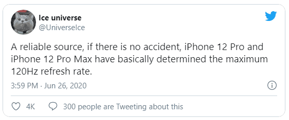Nguồn rò rỉ ngày nay là @UniverseIce , người khá nổi tiếng về rò rỉ Samsung, mặc dù đây không phải là lần đầu tiên ông tuyên bố rằng dòng iPhone 12 có thể có màn hình 120Hz.