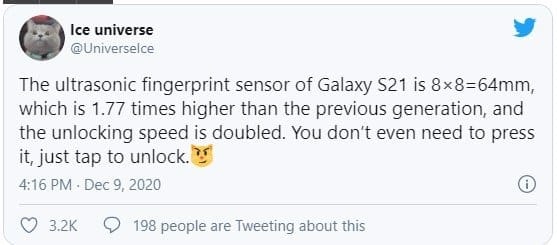 Nhưng nó có thể thay đổi ngay bây giờ vì các tipster cho biết cảm biến vân tay trên Galaxy S21 sẽ là 8 × 8 = 64mm. Rõ ràng, con số này cao gấp 1,77 lần so với thế hệ trước. Tôi nghĩ có lẽ anh ấy đang đề cập đến vùng quét lớn hơn ở đây nhưng chúng ta hãy chờ thêm chi tiết. Điều đó nói rằng, nếu tuyên bố của Ice Universe là đúng, người dùng chỉ cần chạm vào khu vực đó vì tốc độ mở khóa sẽ tăng gấp đôi.
