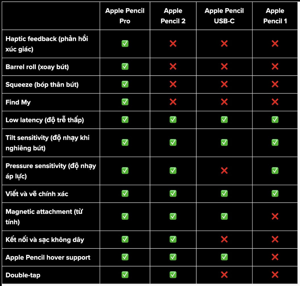 Bảng so sánh Apple Pencil Pro với Pencil 1, Pencil 2 và Pencil USB-C