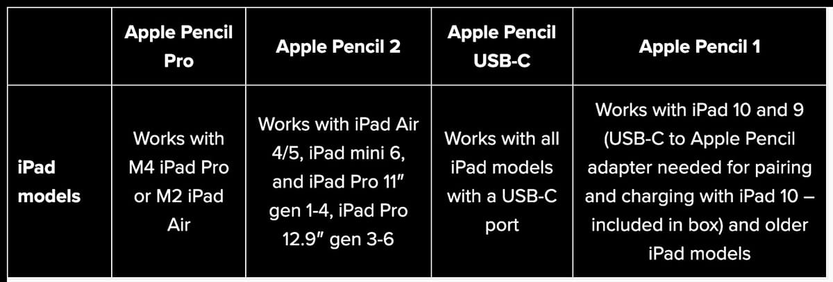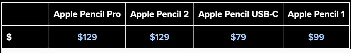 Bảng so sánh Apple Pencil Pro với Pencil 1, Pencil 2 và Pencil USB-C