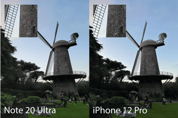 Note 20 Ultra có zoom quang học 5x so với quang học 2x trên iPhone 12 Pro, vì vậy không có gì ngạc nhiên khi Note 20 Ultra cho kết quả tốt hơn ở hạng mục này. Với đủ ánh sáng, các bức ảnh chụp ở 5x bằng Note 20 Ultra trông sắc nét và cân bằng tốt.