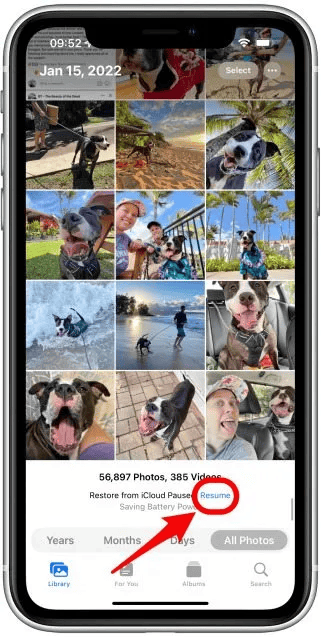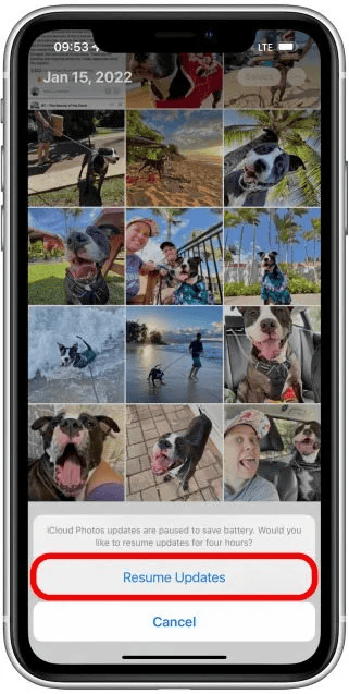 Giống như thiết bị của bạn có thể tự động tạm dừng quá trình tải lên iCloud nếu bạn không kết nối với Wi-Fi, quá trình tải lên của bạn cũng có thể bị tạm dừng nếu pin yếu. Hãy thử cắm điện thoại của bạn vào bộ sạc và nhấn tiếp tục. Nếu bạn vẫn thấy luồng video hoặc ảnh của mình không cập nhật, hãy thử thêm các bước bên dưới.