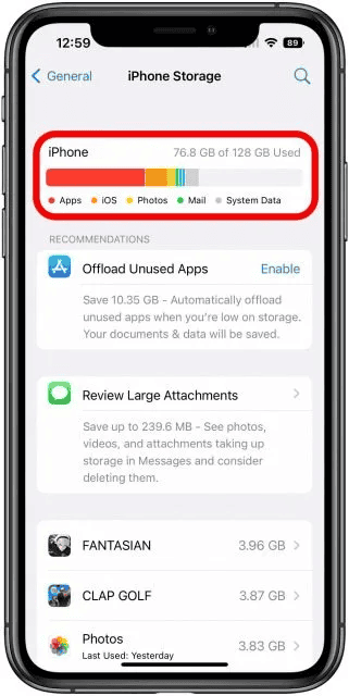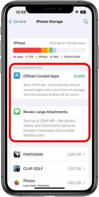 5. Như với Dung lượng iCloud, thiết bị của bạn sẽ đưa ra các đề xuất về cách tối ưu hóa dung lượng lưu trữ của bạn, nếu cần. Chúng có thể được tìm thấy trong phần Khuyến nghị.