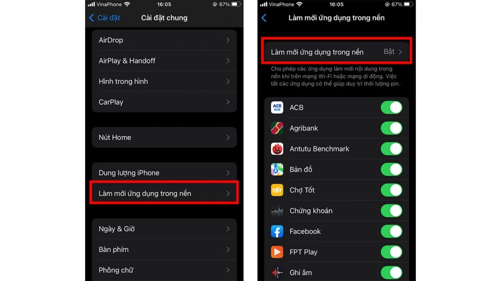 Tính năng này giúp các ứng dụng liên tục Refresh lại mặc dù bạn không sử dụng. Từ đó, máy sẽ tiêu tốn nhiều dữ liệu mạng và tài nguyên. Khiến máy nóng hơn và hao pin hơn cho dù bạn không có sử dụng. Để tắt tính năng này bạn truy cập vào Cài đặt > Cài đặt chung > Làm mới ứng dụng trong nền > Tắt đi những ứng dụng không cần thiết hoặc tất cả ứng dụng nhé.