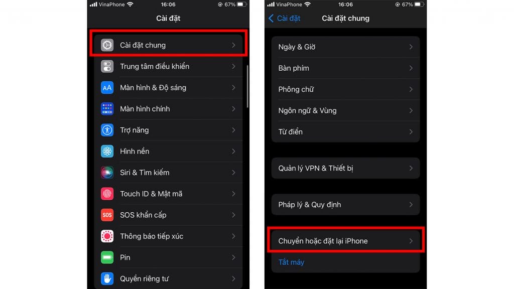 Nếu đã thử các cách trên mà iPhone vẫn không hết tình trạng này bạn có thể thử đến cách Khôi phục cài đặt gốc đưa máy về trạng thái như mới mua. Điều này sẽ giúp bạn khắc phục triệt để các xung đột gây ra bởi các ứng dụng và các tùy chỉnh bên trong máy. Bạn truy cập vào Cài đặt > Cài đặt chung > Chuyển hoặc cài đặt lại iPhone.