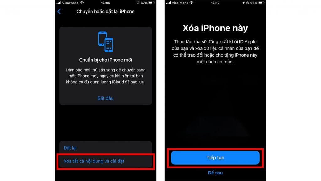 Sau đó, bạn chọn tiếp vào mục Xoá tất cả nội dung và cài đặt. Lúc này máy sẽ bắt đầu xóa toàn bộ sử liệu. Nếu có những dữ liệu quan trọng bạn nên sao lưu lại trước nhé.