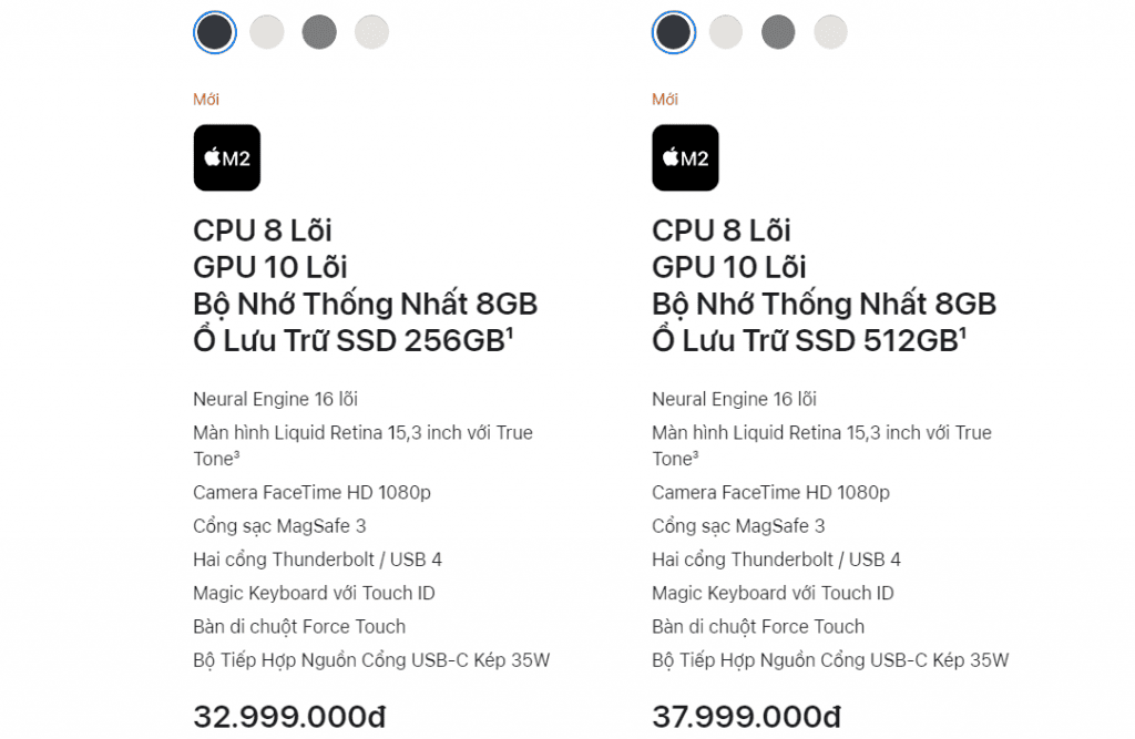 - MacBook Air 15 inch với CPU 8 nhân, GPU 10 nhân, model M2 với RAM 8GB và SSD 512GB có giá 37.999.000đ.