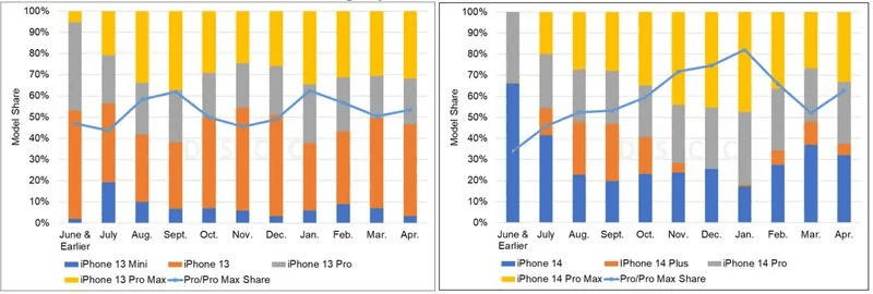 Nhìn chung, dòng iPhone 14 có vẻ phổ biến hơn một chút so với dòng trước đó, với số lượng lô hàng bảng điều khiển hàng năm tăng 2% tính đến tháng 4, rõ ràng là do doanh số bán hàng của các mẫu Pro đắt tiền hơn tăng lên tại chi phí của ít mẫu iPhone 14 tiêu chuẩn được bán hơn.