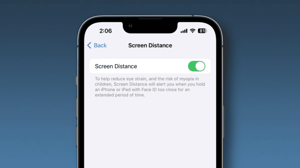 iOS 17 và iPadOS 17 bao gồm tính năng Khoảng cách màn hình (Screen Distance) mới có thể cảnh báo bạn khi bạn giữ iPhone hoặc iPad quá gần mắt trong thời gian dài. Apple cho biết tính năng chọn tham gia được thiết kế để giúp giảm nguy cơ cận thị ở trẻ em bằng cách khuyến khích thói quen xem lành mạnh và có thể giúp giảm mỏi mắt nói chung.
