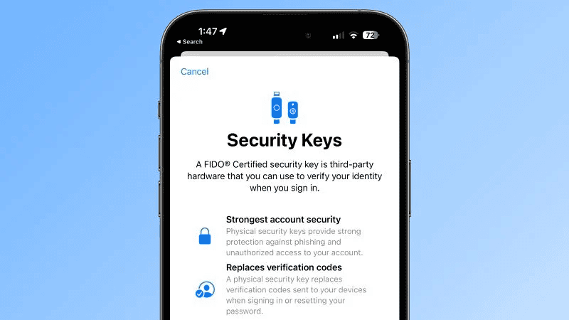 Bạn có thể thiết lập Khóa bảo mật trên các thiết bị chạy iOS/iPadOS 16.3 bằng cách truy cập ‌Apple ID‌ > Khóa bảo mật và làm theo hướng dẫn. iPhoneiPad và Mac hỗ trợ các khóa bảo mật được FIDO Chứng nhận chẳng hạn như Yubikey.